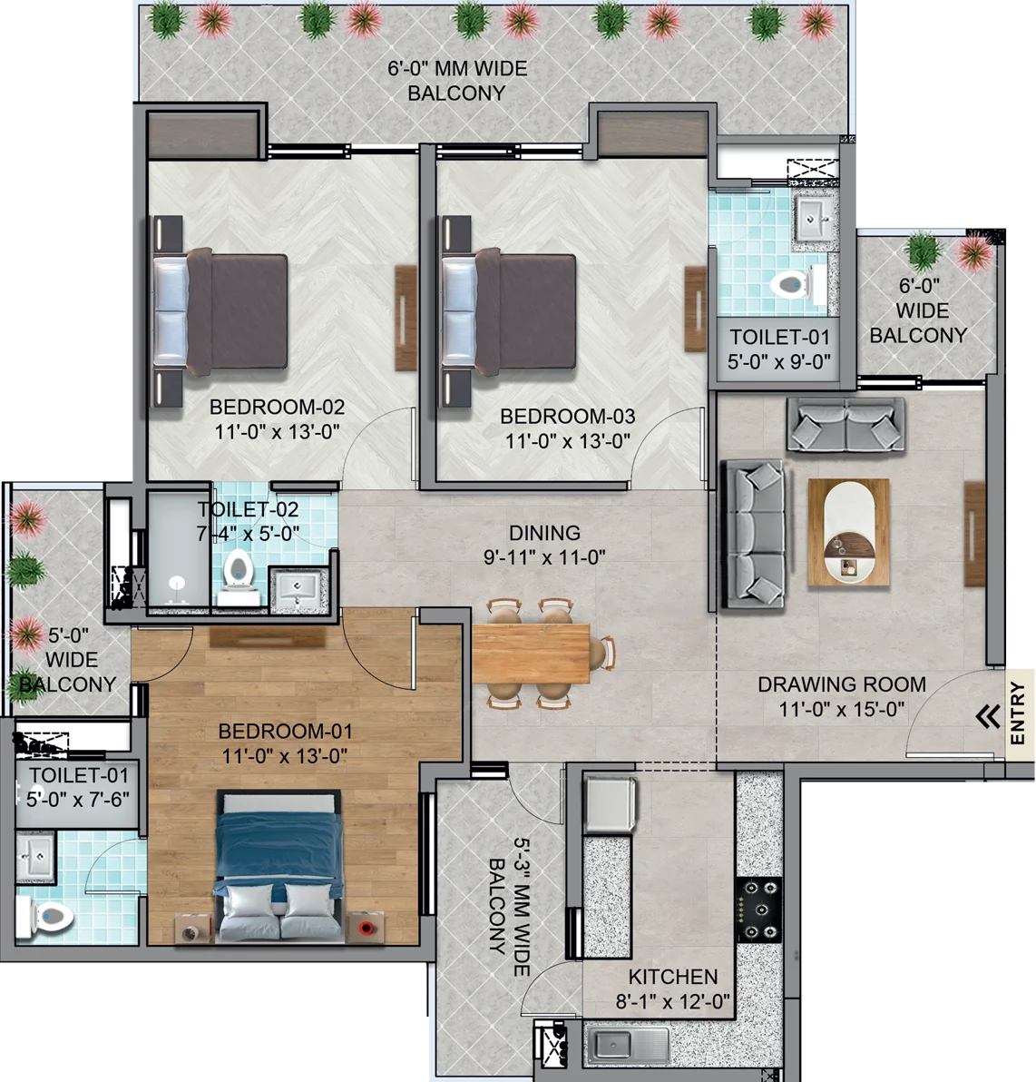 - Apartments Size: 2 BHK 1200 Sq. Ft & 3 BHK 1855 Sq. Ft